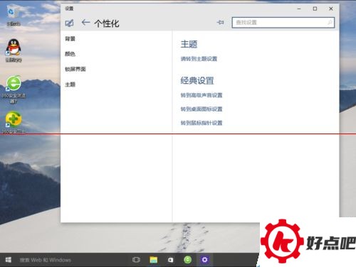 先进入个性化设置的界面,用鼠标点选最后一个名为“主题”的选项。接着,再用鼠标点击右侧列表里经典设置下的“转到桌面图标设置”。