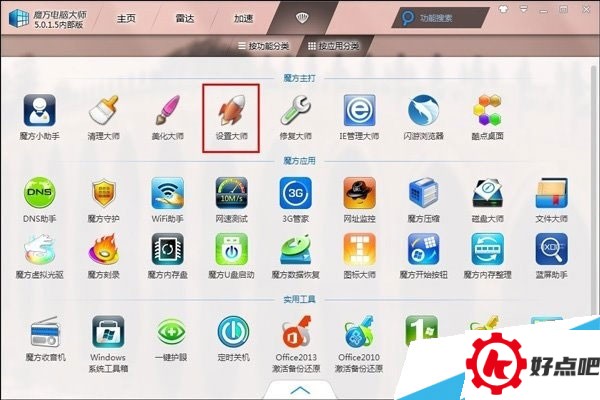 先下载并安装魔方电脑大师,要是不想安装的话,也能够直接下载绿色版,这个绿色版同样具备隐藏硬盘分区的功能。接着,在魔方电脑大师的功能大全之中,选择“设置大师”就好了。