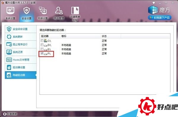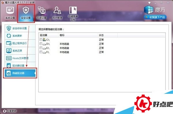 你看下面这图,在魔方设置大师这个软件里,要这么操作:先找到安全设置,然后选择隐藏驱动器。