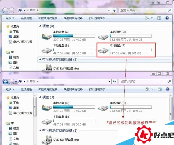 4. 这时候,再把“我的电脑”打开,将它和之前的截图做个对比,查看一下硬盘分区是不是已经成功隐藏起来了呢?你会发现,之前存在的F盘消失不见了。