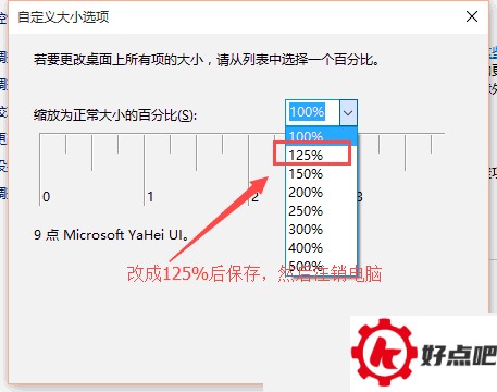 先将缩放比例调整为125%,之后确定并保存,再注销电脑就可以了。