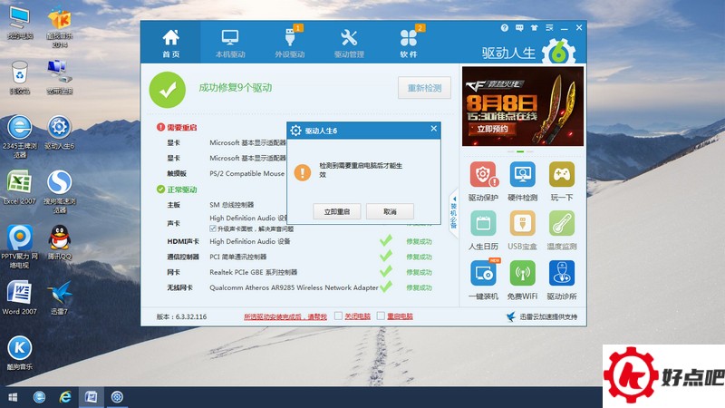 把所有驱动都安装好之后,就会有这样一个提示:“检测到只有重启电脑才会生效”。这时候,点击“立即重启”这个按钮,电脑就会重新启动了。