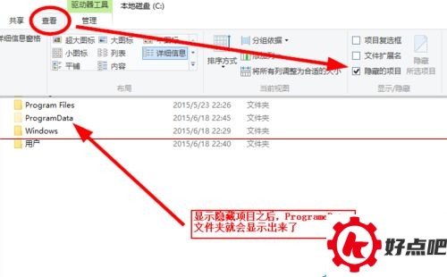 要是隐藏的文件夹没显示出来,那就把“显示隐藏文件夹”这个选项打开。在资源管理器里,点一下“查看”,然后找到“隐藏的项目”并打上钩。这么操作之后,ProgrameData文件夹就能显示出来了。