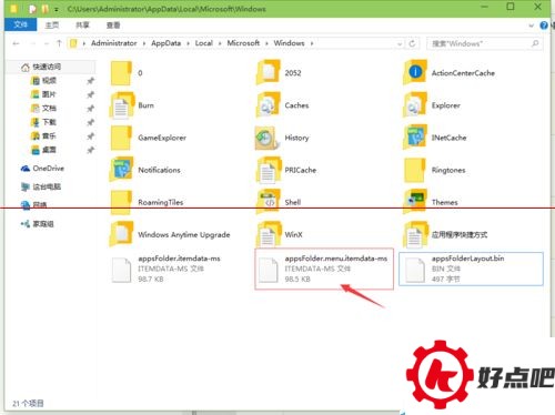 2. 在弹出窗口点击一次,就能进入“Microsoft”,接着进入“Windows”,找到名为“appsfolder.menu.itemdata - ms”的文件。这个文件就是开始菜单设置的存储文件哦。就像下面图标注的路径和文件那样。