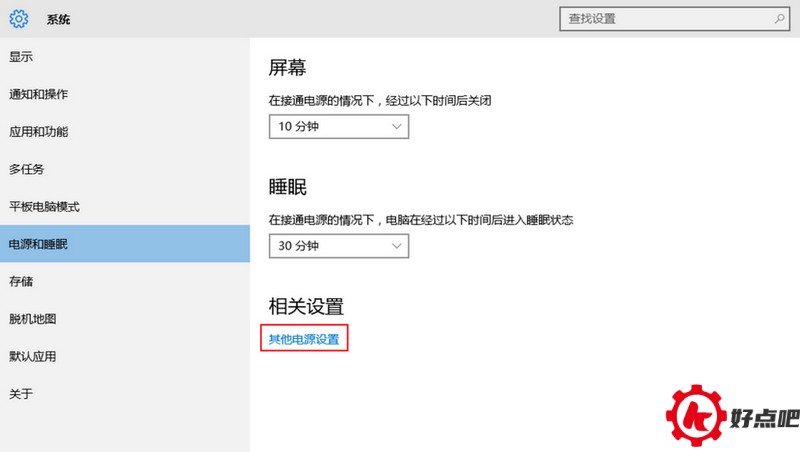 接着就会进入系统面板,这时我们能看到一个名为“电源和睡眠”的选项。单击这个选项后,就会进入如图所示的界面,然后我们再点击“其他电源设置”按钮。