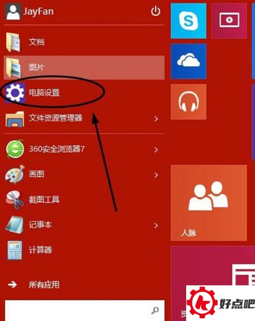 在win10系统的桌面上,去点一下“开始”菜单,接着再点“电脑设置”。就像下面图里显示的那样。