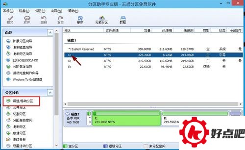 首先,下载一款免费的win10分区工具,它叫分区助手,然后把它安装好并运行起来。运行之后会出现主界面,这时能看到C盘的容量大概显示为223GB。接着,选中C盘,再点击“调整/移动分区”这个选项。