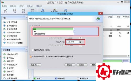 2. 打开这个对话框后,就能调整分区大小了。当鼠标指针变为双向箭头时,就开始拖动,一直拖到你觉得容量合适的位置。比如说,我们可以把C盘调整为150GB的大小。最后,点击“确定”就行。