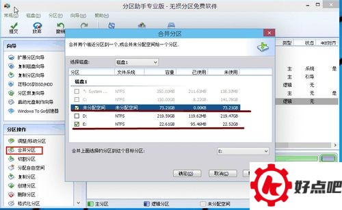 4. 要是你还想利用这个未分配的空间呢,我们能发现E盘的空间特别小,大概就22GB左右。这时候啊,就可以把这部分“未分配空间”并入E盘。先把E盘选中,再点击左边任务栏里的“合并分区”。