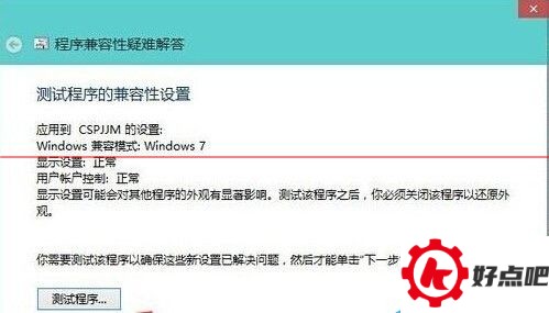 要是检测到这个程序的兼容模式是WIN7呢,那就去点击“测试程序”。要是这时候能正常运行的话,再去点“下一步”就好了。