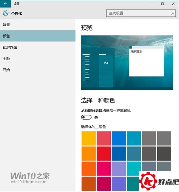 Win10系统的主题色有两种获取来源。一种是自动根据背景图片来选择,还有一种是从微软所提供的一些颜色里挑选。就像下面图里展示的那样。
