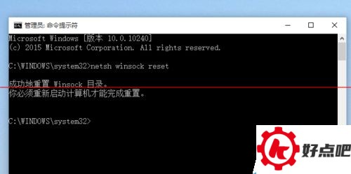 打开弹出的对话框,接着在里面输入“netsh winsock reset ”这个命令,然后按回车键来进行确认。