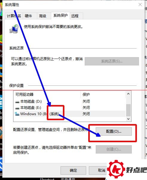 3. 去“保护设置中”点击选择磁盘,你想之后还原哪个磁盘就选哪个,然后再点击“配置”。
