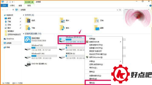我们在桌面上左键双击“此电脑”,这时会打开资源管理器窗口。在这个窗口里,找到系统盘(C:),然后右键单击它,接着在弹出的右键菜单里,再用左键点击“属性”。