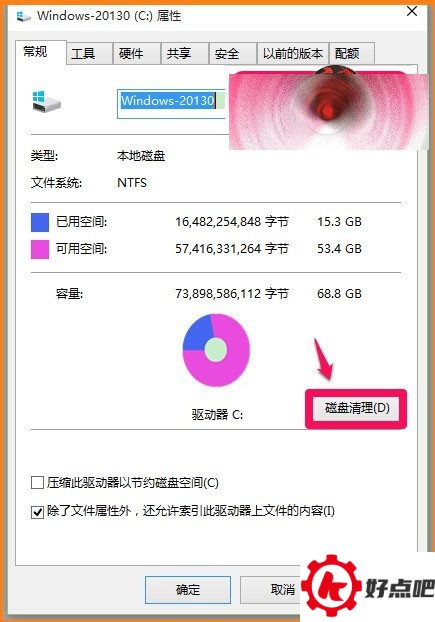 在Windows10 - 10130系统里,打开C盘的属性窗口后,我们用鼠标左键去点击“磁盘清理”这个选项。