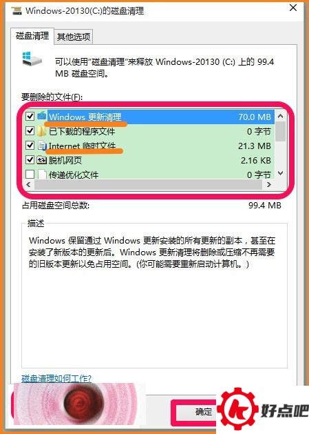 扫描完了之后呢,就能看到Windows更新清理占了70.0MB的空间。我的计算机是格式化C盘之后才安装的系统,所以没有Windows old文件,除此之外还能看到一些别的文件呢。这时候,点击“确定”就行。