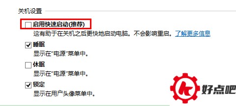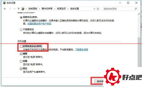 接下来,在这个界面的最下方有个“关机设置”栏目。在这个栏目里,要把“启用快速启动(推荐)”项前面的勾选清除掉。之后,点击“保存修改”按钮,这样就完成设置了。