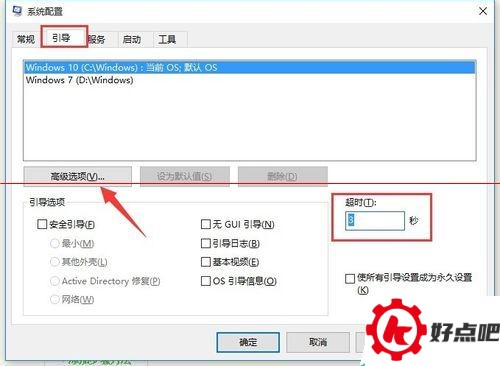 先切换到“引导”这个选项卡,然后把“超时”的设置改成“3”秒,接着再点击“高级选项”按钮。