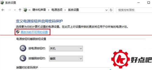 先打开“控制面板”,然后在其界面里,按顺序进入“硬件和声音”,再进入“更改电源按钮的功能”这个界面,接着点击“更改当前不可用的设置”按钮。