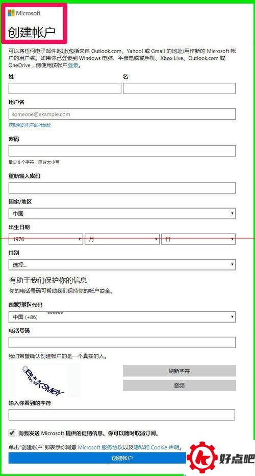 当把注册Micrososft帐号(这里应是Microsoft帐号,原文可能拼写有误)所需的信息都填写好以后,就可以点击“创建帐户”了。