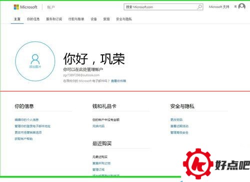 我们点击“创建帐户”之后,系统就会显示出一个主页,上面写着“你好,巩荣”,这就表明我们的Microsoft帐号创建成功了。