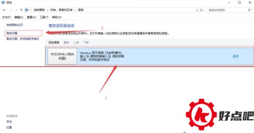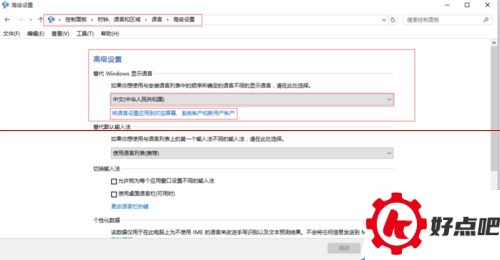 8. 回到上层,进入控制面板里的语音选项。首先得看看语音首选项是不是中文,之后再点击高级选项。把替代windows显示语音改成中文,最后点击下方的蓝字。