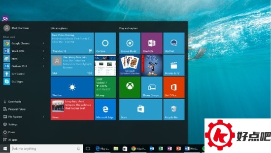 Windows 10的开始菜单和人们一直以来习惯用的开始菜单不一样。它更像是Windows 7的开始菜单与Windows 8的开始屏幕组合而成的。这个菜单里有很多实时图块(Live Tiles),还包含不少Windows Store应用程序。打个比方,就像你把Windows 7开始菜单里的一些元素和Windows 8开始屏幕的部分功能揉到了一起。有些评测人员觉得,Windows 10的开始菜单更像是个仪表板,而不太像一个用来启动程序的平台。